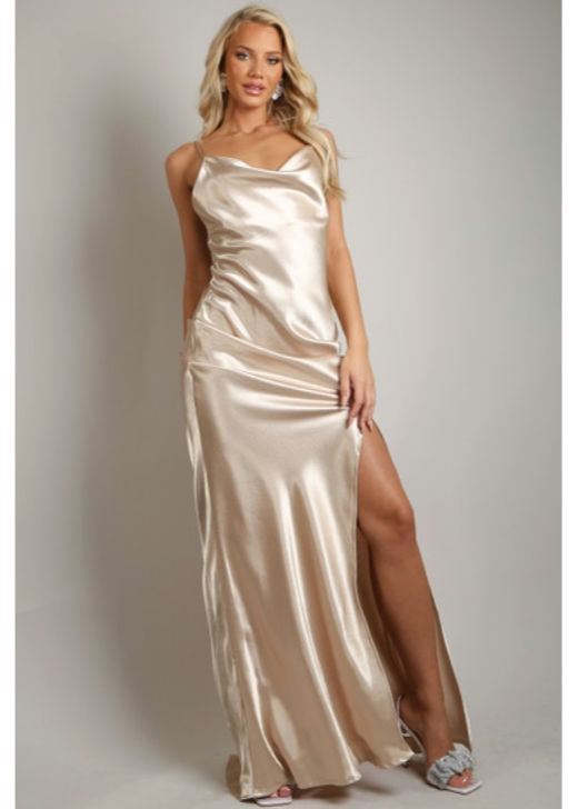 STRETCH SATIN CUPPED COWL NECK DRESS